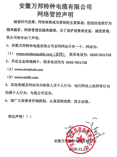 鄭重聲明:安徽萬邦特種電纜有限公司官方網站為:www_wanbangcable_com.2008fg.cn,除此之外無任何子網站或合作網站,其余均為假冒偽劣。電話:0550-7621728 13485756353 地 址:安徽省天長市滁州高新技術產業開發區經四路29號